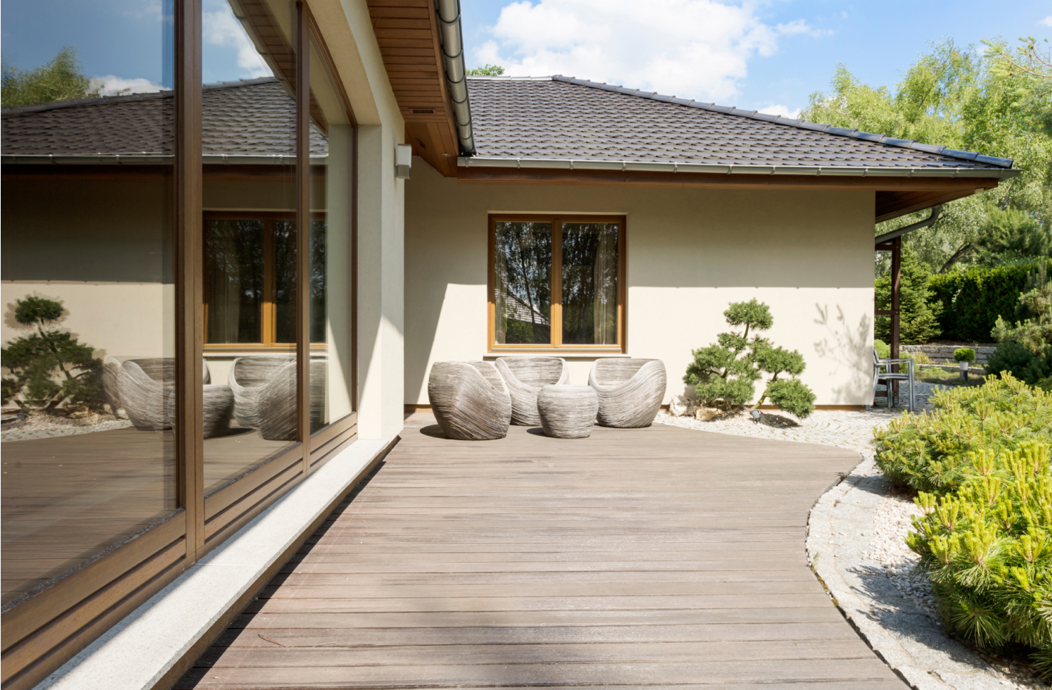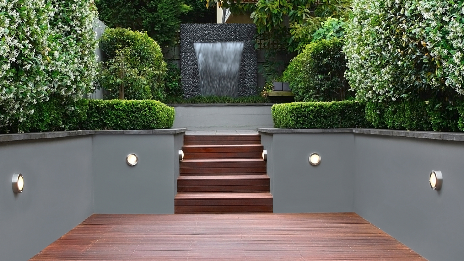 Deck boards with a fiery red and orange hue blended into brown tones, such as red gum and jarrah, make an outdoor space look warm and inviting. A lush green landscape of lawn, succulents and tropical foliage will beautifully complement that otherwise dominant hue. Keep the rest of the scheme on the downlow, with natural stone colours such as Mineral Salt and charcoal (Road Ahead). Add a pop of bright colour with cushions in mint or red to change up the look from season to season.