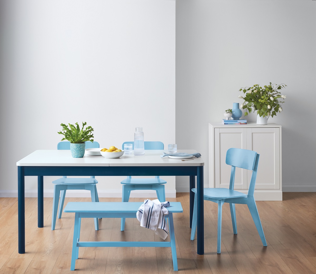 For example, we’ve used Kara Sea on the legs and frame of this table. We tinted I’m Blue with white for the sky-blue colour of the chairs and bench.